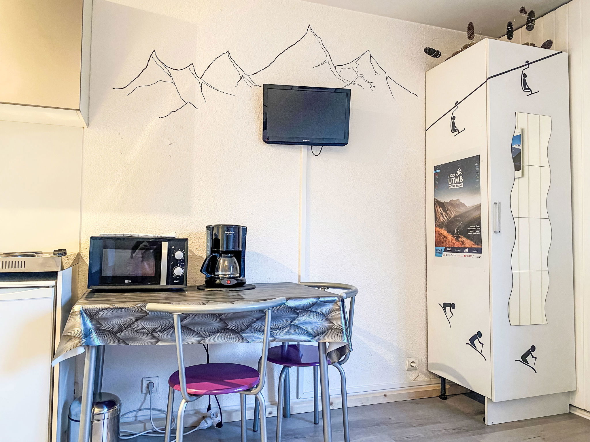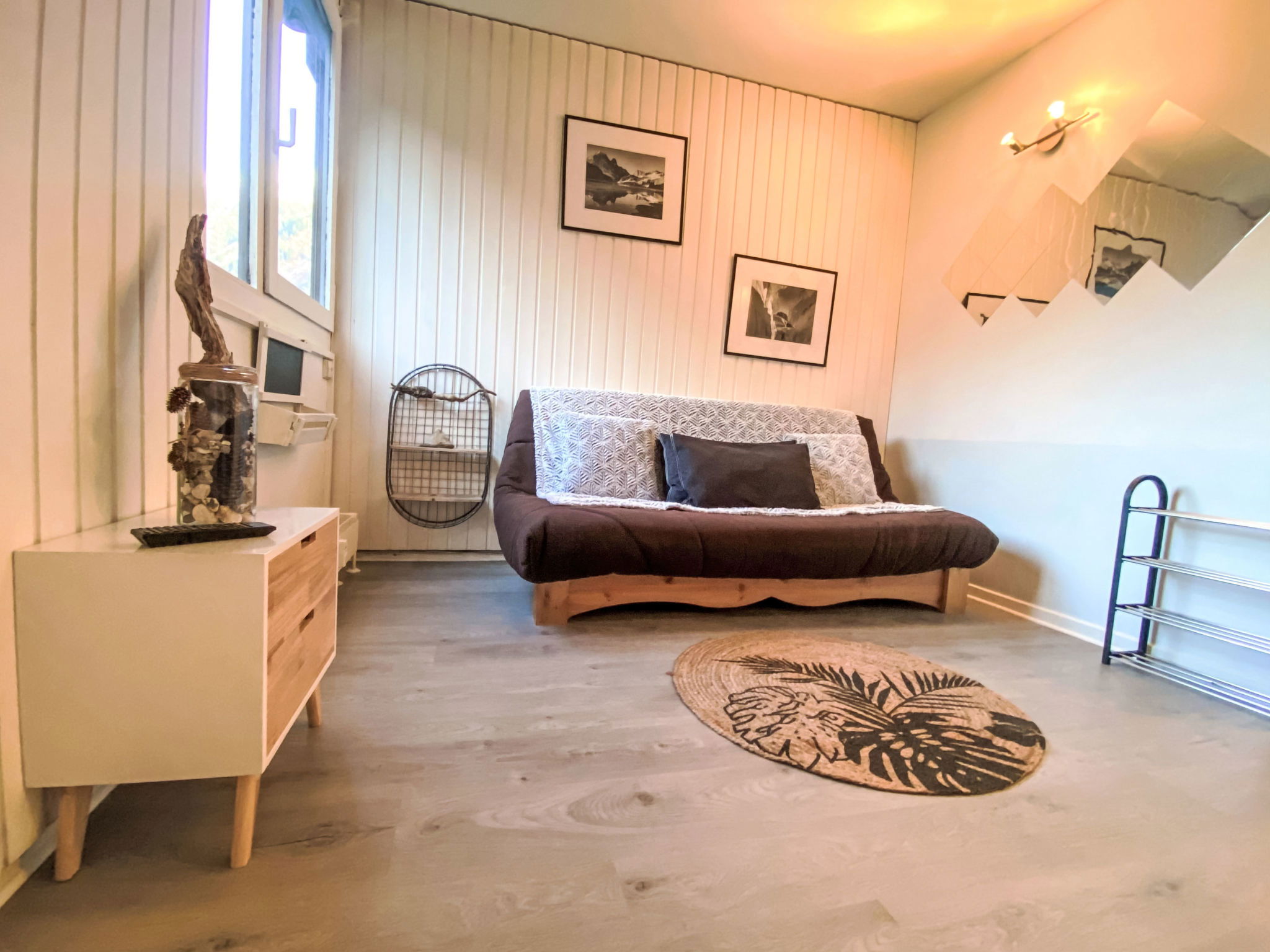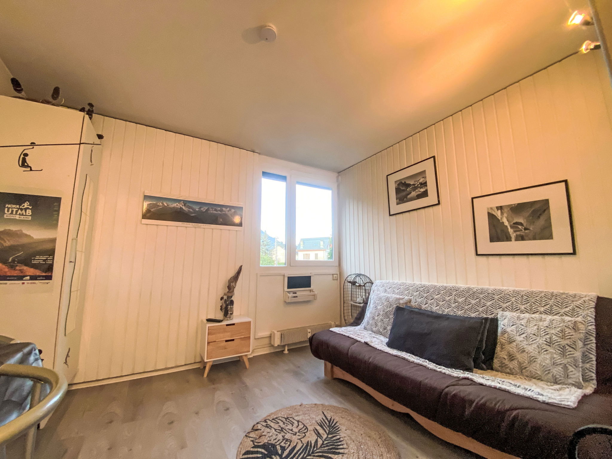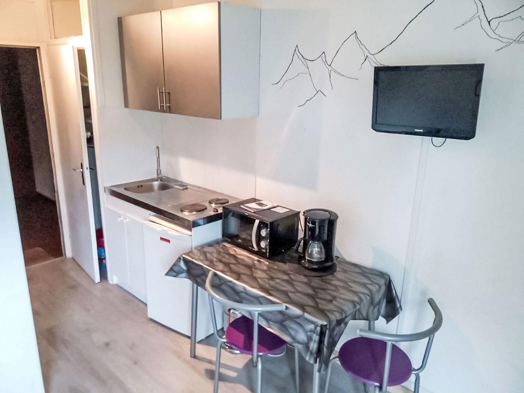 1-room studio 18 m2 on 2nd floor. Very simple furnishings: living/dining room with 1 double sofabed (140 cm, length 190 cm), TV. Kitchenette (2 hot plates, kettle, microwave, electric coffee machine). Shower/WC. View of the mountains. Facilities: Internet (WiFi, extra). Parking at the house. Please note: non-smokers only. Maximum 1 pet/ dog allowed. TV only FR. Smoke alarm. 74056002283K0