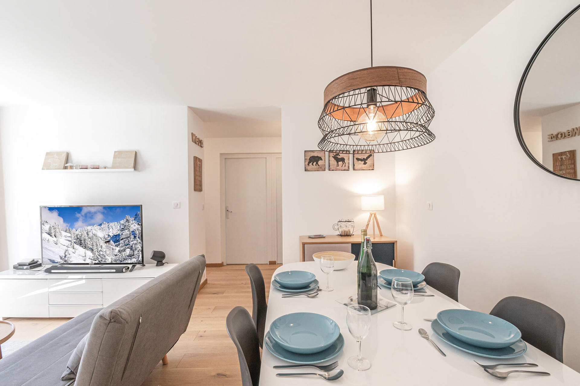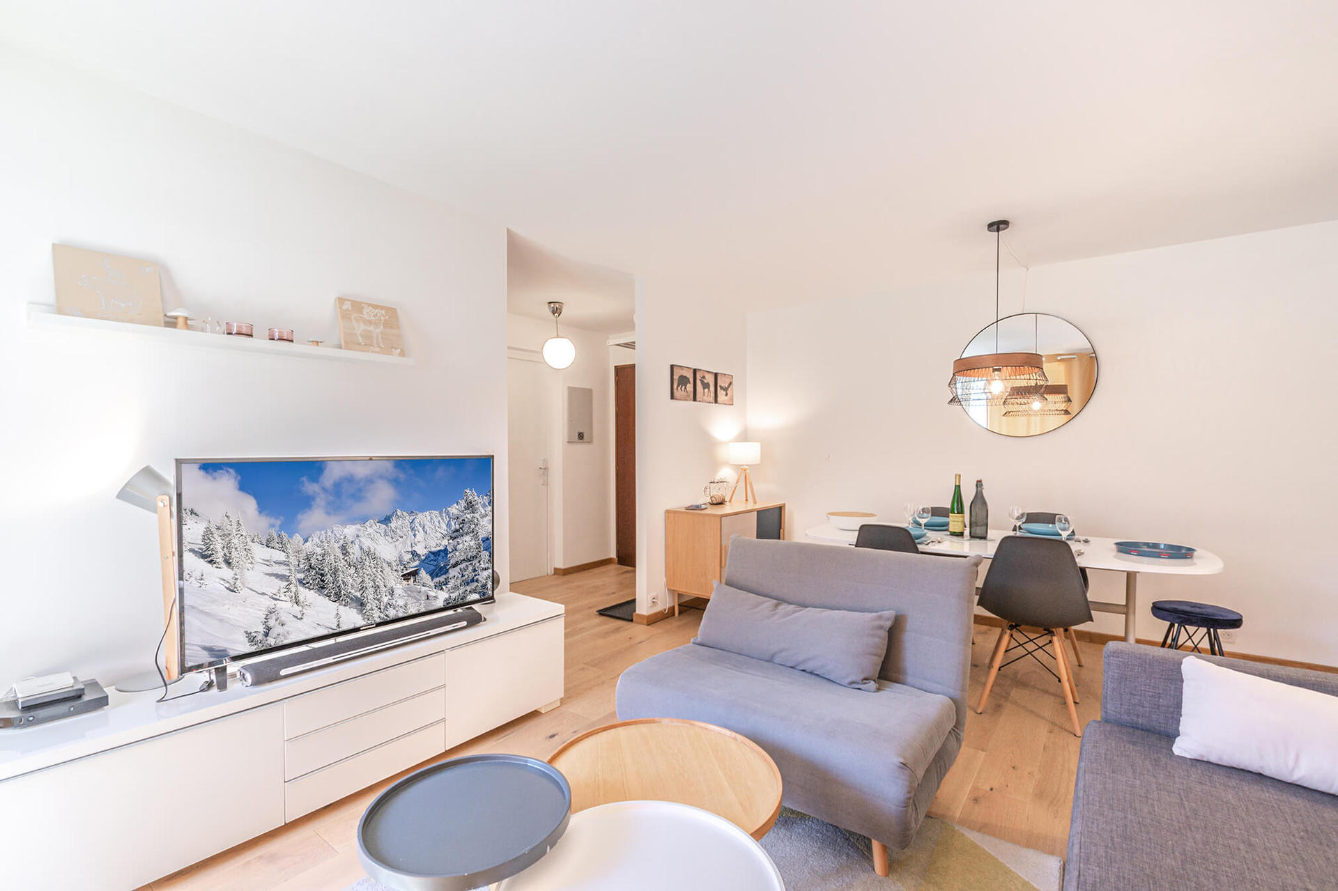 - Living/dining room with TV, sound bar, double sofa bed (140x190)