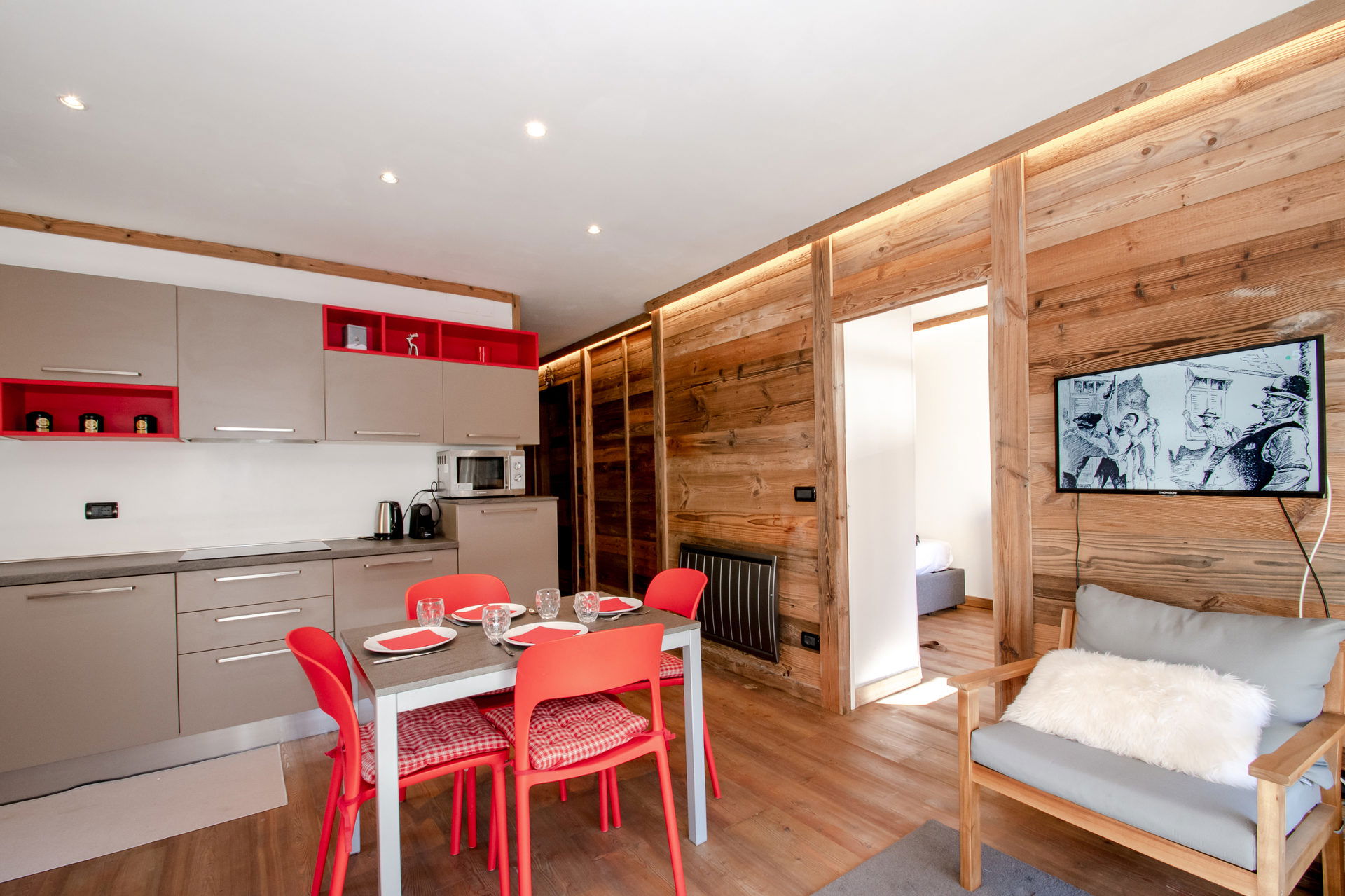 - Living space composed of a living room with TV, dining area and open fitted kitchen