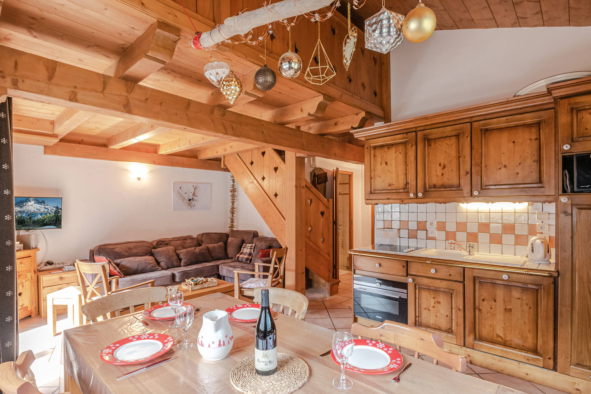 - Opened kitchen area equipped (ceramic hob, dishwasher, fridge, oven, microwave, filter coffee maker, Nespresso, kettle, toaster, mixer, raclette set, fondue set, plancha)