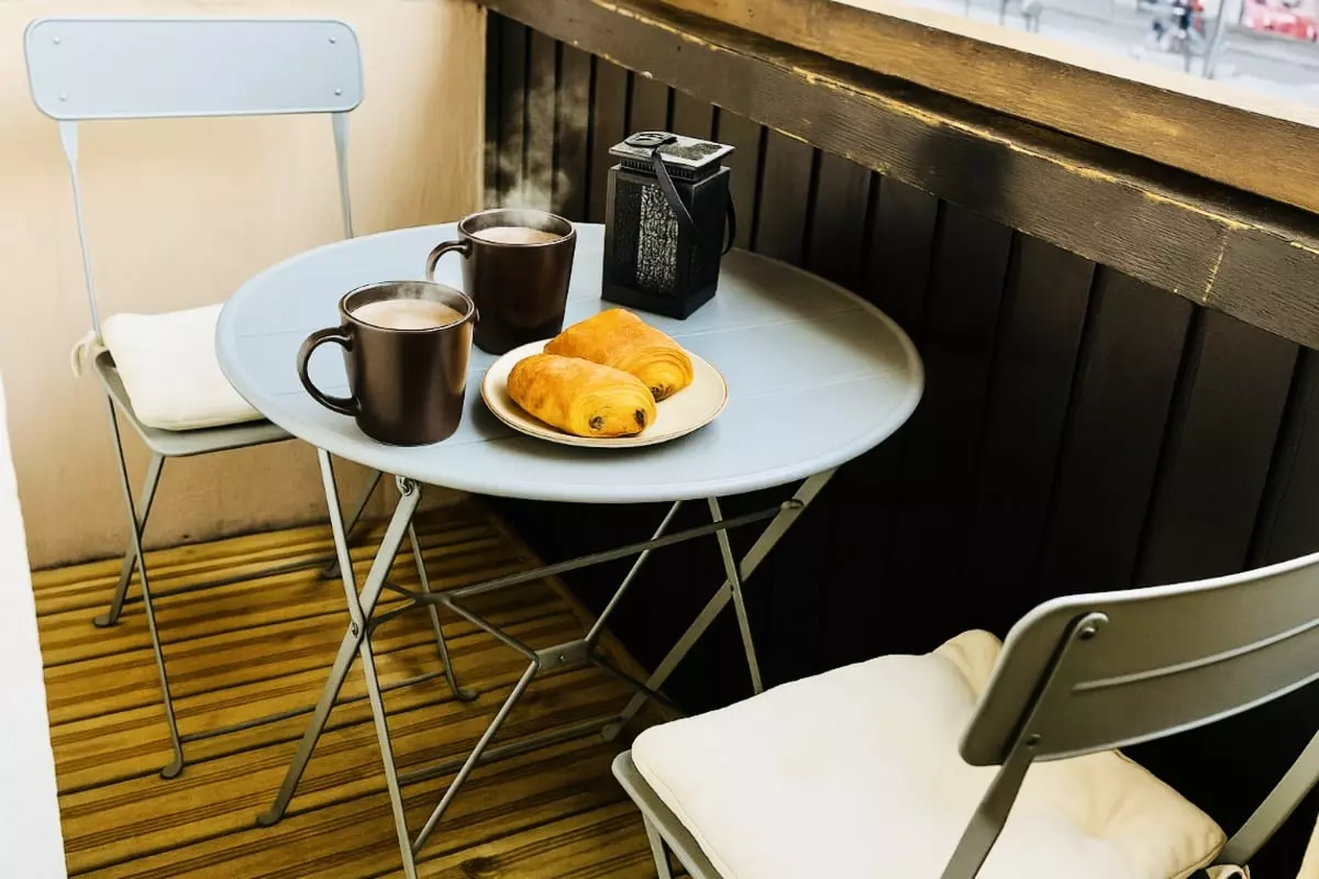 - small terrace overlooking Mont-Blanc with two chairs and a bistro table.