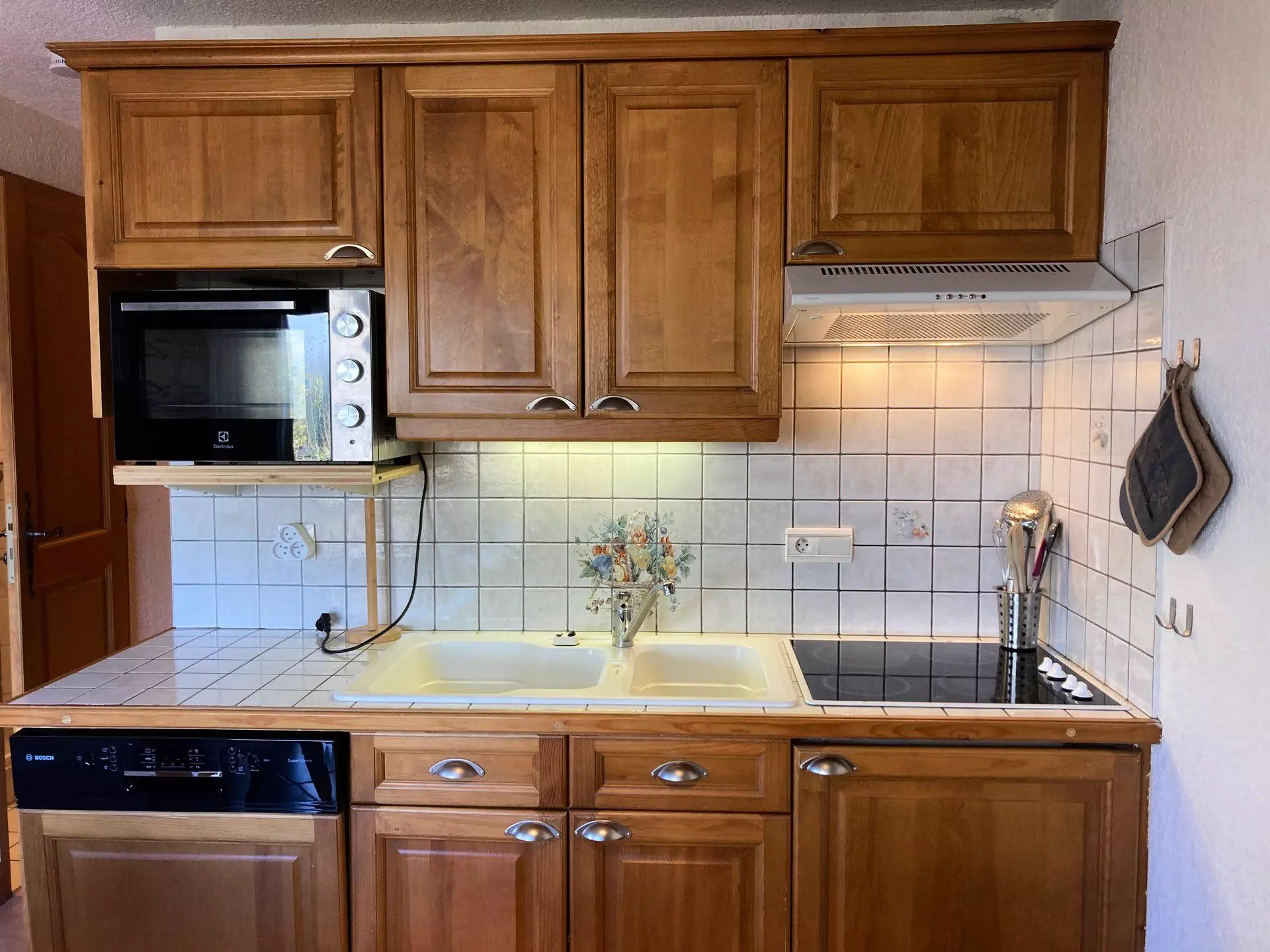 - A kitchen equipped with 4-burner ceramic hob, oven, dishwasher and refrigerator
