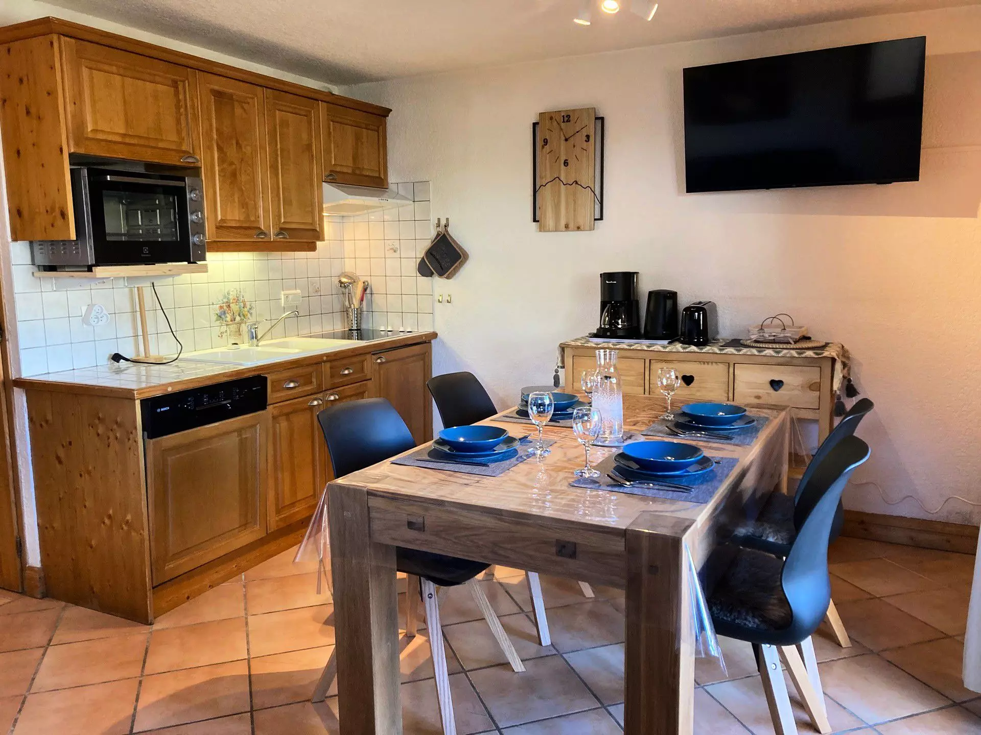 The apartment enjoys views of the Fiz mountain range and the Mont Blanc range from the balcony.